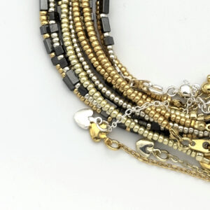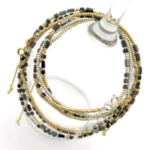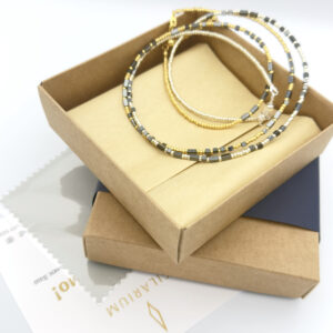 Фурнитуру можно выбрать в трёх оттенках под благородные металлы: серебро, лимонное золото (14K) и золото (18K) — чтобы DIT DAH легко сочетался с вашими украшениями и часами. Смысл записан азбукой Морзе и проявляется не текстом, а ритмом: в итоге получается графика из бусин, аккуратная и уместная.