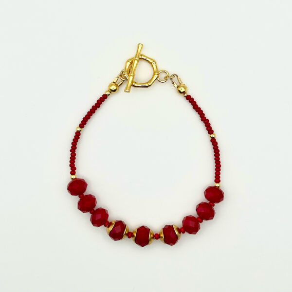 Браслет из коллекции Carmine and Gold создан как ода яркому контрасту. Красные бусины из стекла переливаются живым блеском, а фурнитура цвета золота 24К усиливает насыщенность палитры, делая аксессуар заметным акцентом.