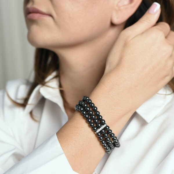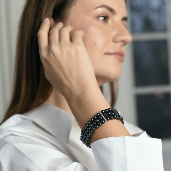Браслет из коллекции Power Orbit создан для тех, кто ценит энергию и динамику. Чёрные бусины на эластичной основе в сочетании с родиевой фурнитурой формируют лаконичный и современный образ. Украшение выглядит стильно и универсально, сохраняя удобство в носке.