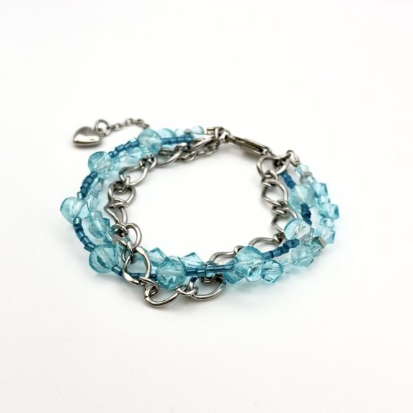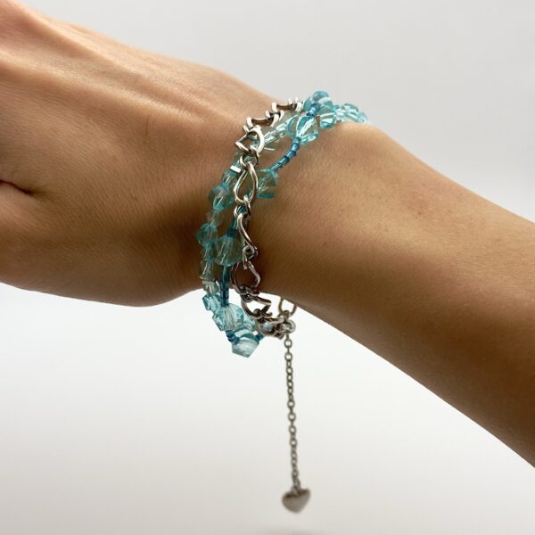 Браслет из коллекции Tender or Brutal с бусинами из голубого стекла и металла выражает игру противоположностей. Родиевая фурнитура придаёт холодное сияние, а длина 18,5 см с удлинителем 7 см делает посадку удобной. Бисер Preciosa добавляет текстурность, подчеркивая многослойность образа.
