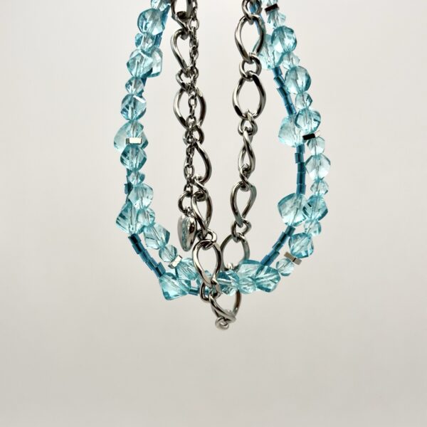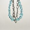 Вес — 16,5 г, застёжка — тогл; ювелирный тросик и металлическая цепь обеспечивают надёжность. Концепция Tender or Brutal — диалог мягкости и силы: стеклянные бусины символизируют хрупкость и свет, массивная цепь — решительность. Контраст материалов создаёт динамичный силуэт. Голубой оттенок добавляет свежести и лёгкости, а металл фиксирует композицию.