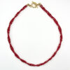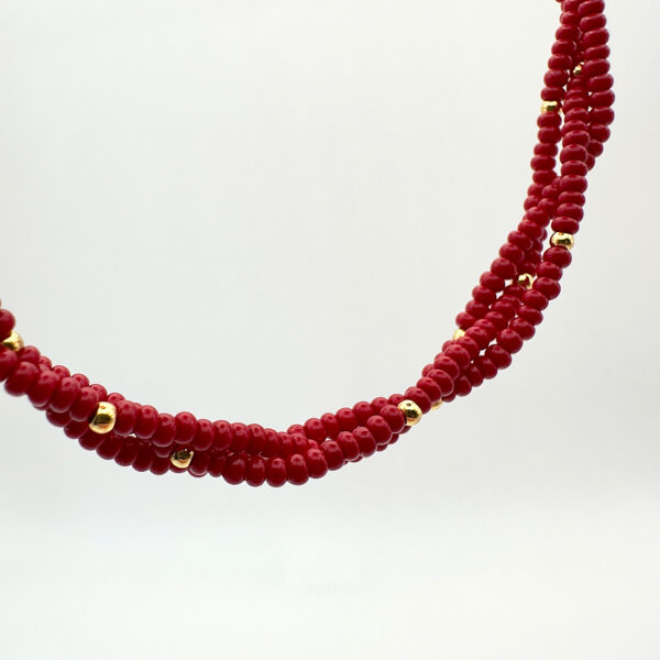 Колье из коллекции Carmine and Gold создано на диалоге тёплых карминово-красных оттенков и благородного золотого блеска. Бисер Preciosa формирует ровный ритм и мягкие переливы цвета, а фурнитура с позолотой добавляет тепла и торжественности. Линия смотрится лаконично и выразительно, подчёркивая контур шеи.