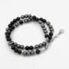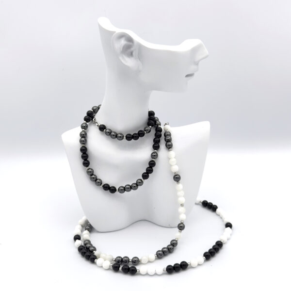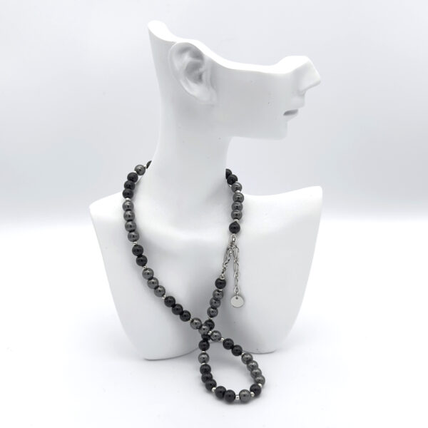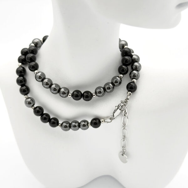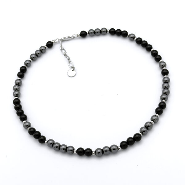 В композиции сочетаются полированные бусины чёрного гематита и чёрного агата. Гематит отвечает за металлический отблеск и графичность, агат за спокойную плотность цвета и более тёплую глубину. Родиевые проставочные бусины и фурнитура добавляют тонкие холодные отблески и делают ритм композиции точнее.