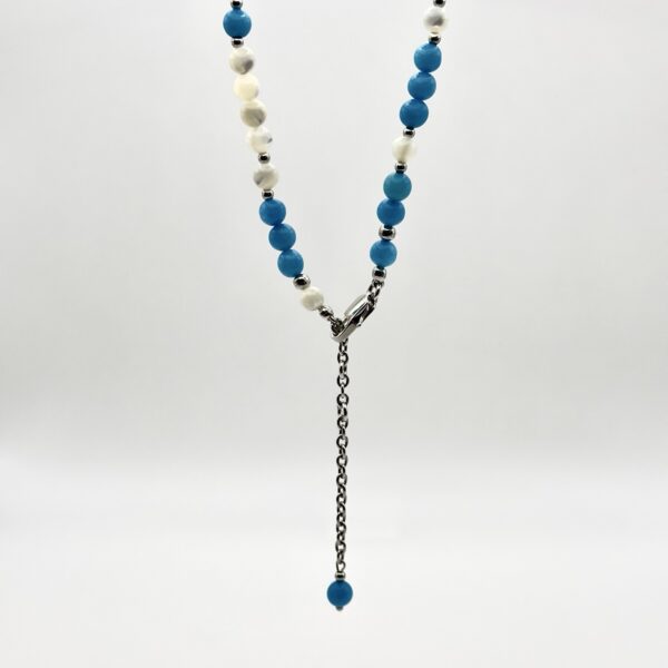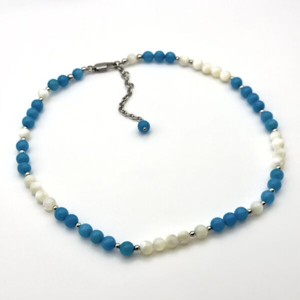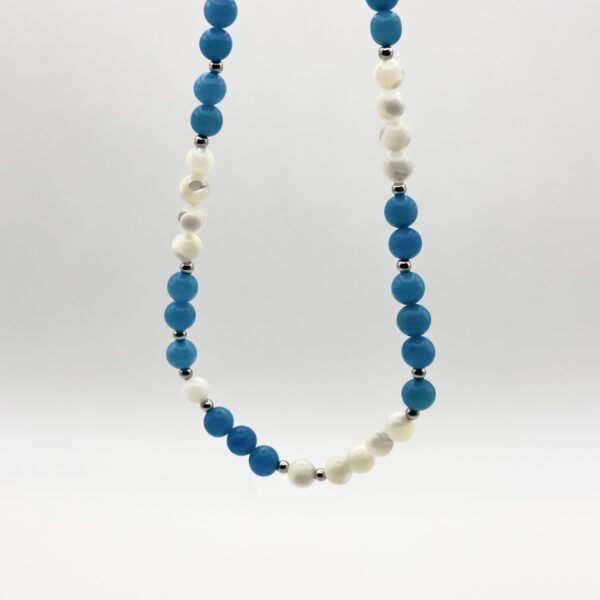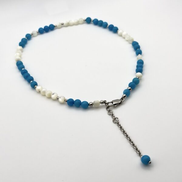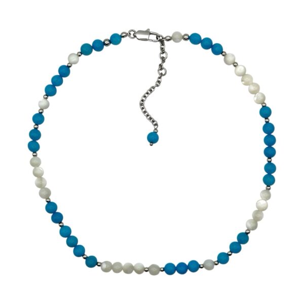Колье из коллекции Color Crush с бусинами из белого и голубого перламутра, стекла и металла передаёт жизнерадостное настроение. Родиевая фурнитура подчёркивает игру светлых оттенков, а длина 41 см с удлинителем 6 см позволяет адаптировать посадку. Лёгкая асимметрия делает украшение динамичным и современным.