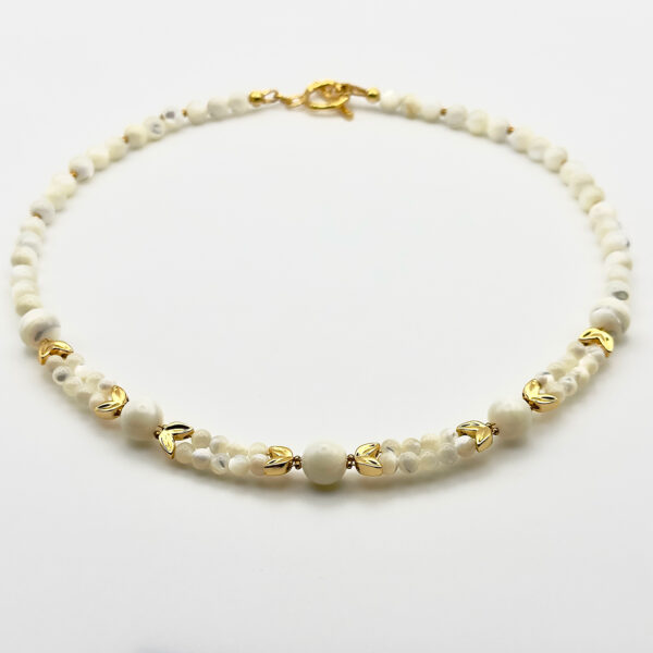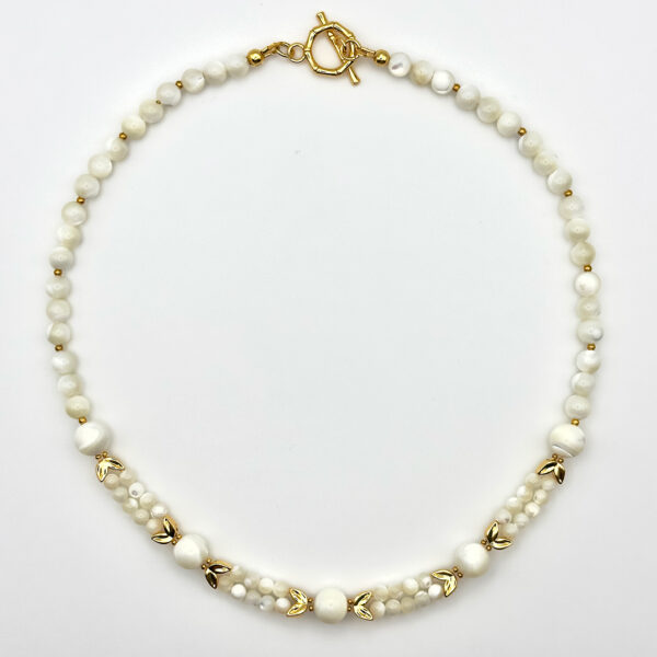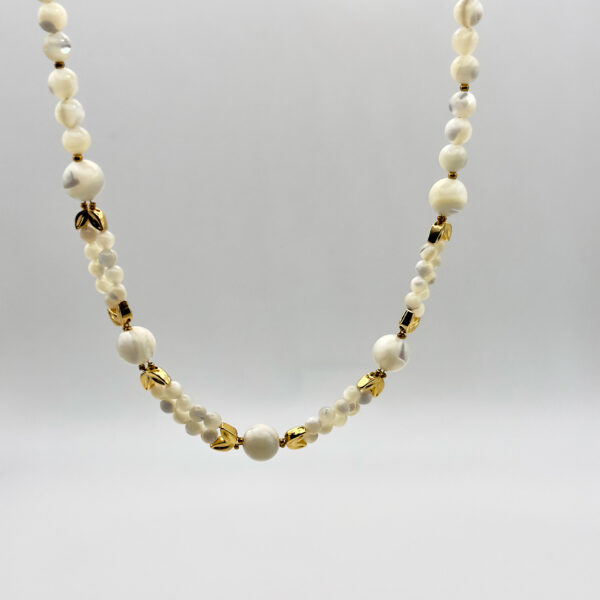 Колье из коллекции Demeter с бусинами из перламутра и металла отражает красоту и изобилие природы. Белая гамма выглядит сдержанно, а фурнитура с покрытием золота 24К добавляет тёплый акцент, делая украшение гармоничным и выразительным.