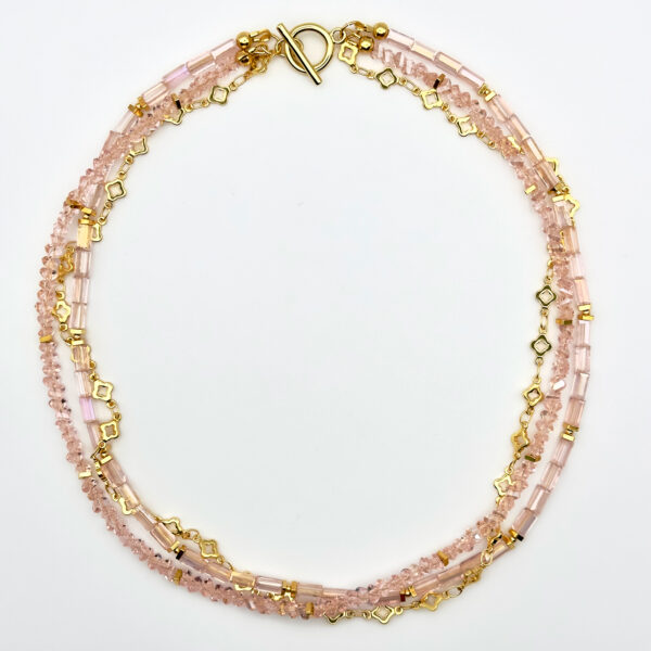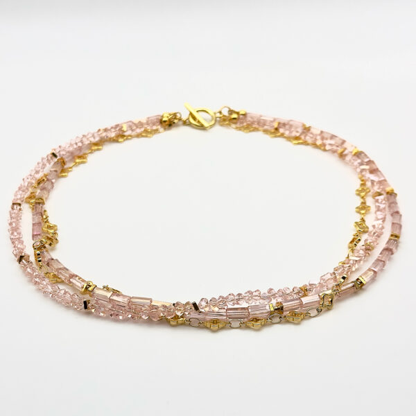 Колье из коллекции Lucky Shine с розовыми бусинами из стекла и металла создаёт атмосферу нежности и оптимизма. Золото 18К на фурнитуре подчёркивает тёплый оттенок и добавляет сияния, превращая украшение в праздничный акцент.