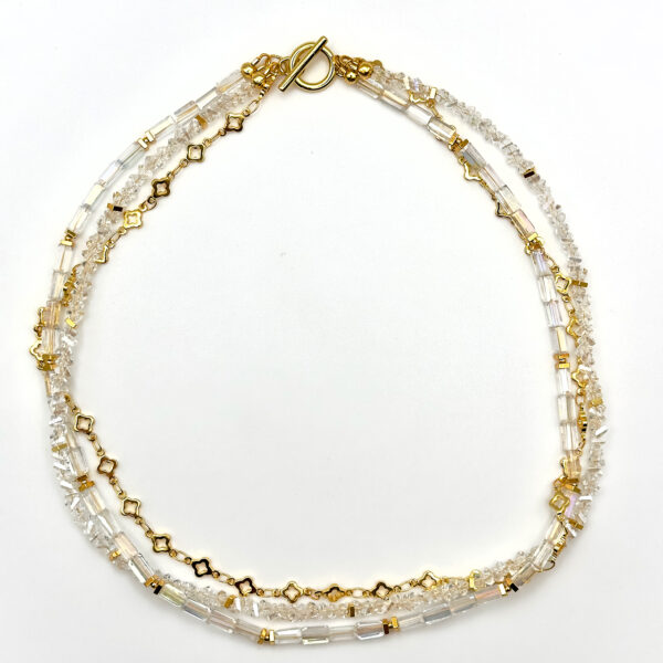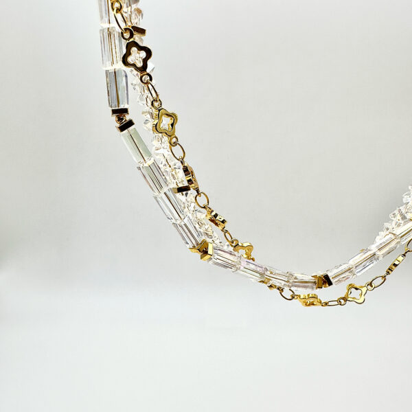 Длина — 45 см, вес — 26 г, застёжка — тогл; металлическая цепь и ювелирный тросик обеспечивают надёжность. Lucky Shine вдохновлена символом четырёхлистного клевера, который традиционно считается знаком удачи и благополучия. Стекло отражает свет живыми бликами, а металлические детали подчеркивают структуру. Украшение работает как лёгкий амулет, добавляющий уверенности.
