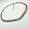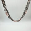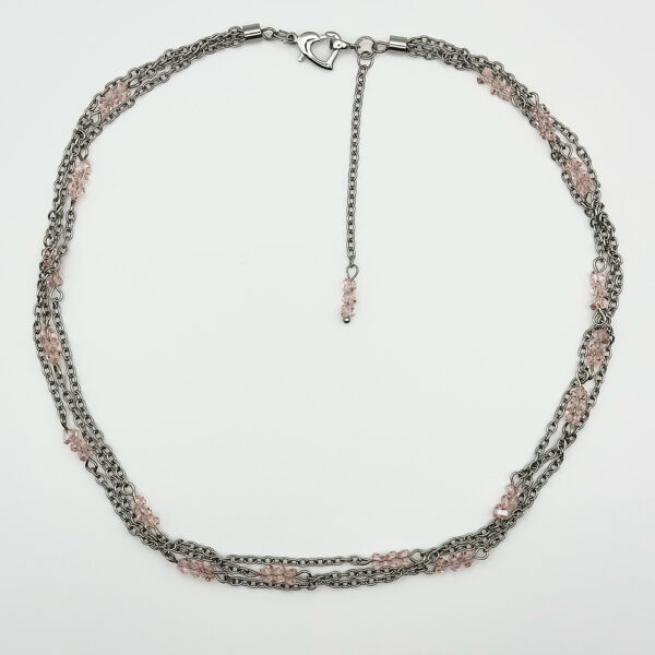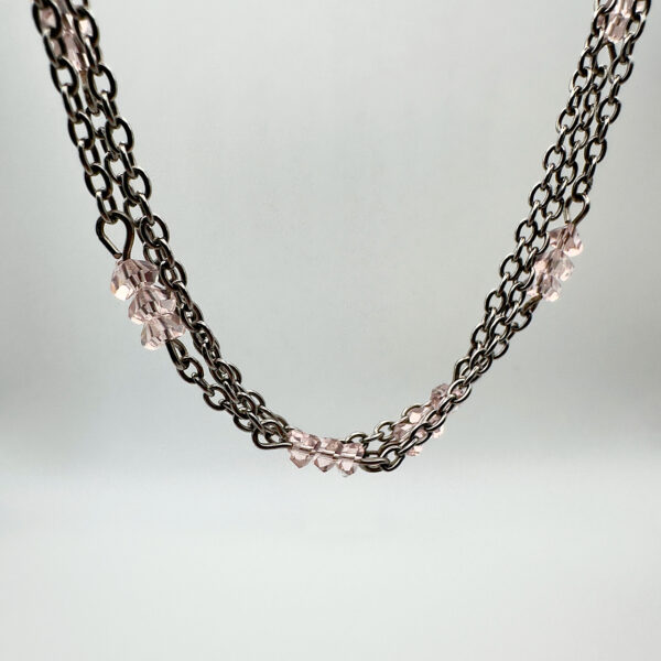 Колье из коллекции Past. Now. Forever. с бусинами из розового стекла отражает историю о трёх измерениях времени и ценности мгновения. Нежная палитра розовых оттенков в сочетании с родиевой фурнитурой создаёт лёгкий и гармоничный акцент.