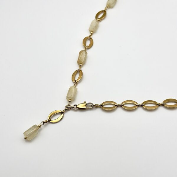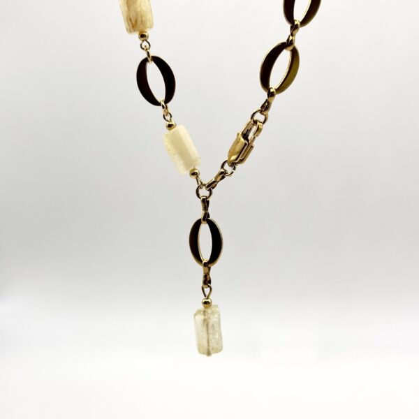 Вес — 30,7 г, застёжка — карабин-лобстер; металлическая цепь поддерживает прочность. Концепция Raw Beauty — аутентичность и баланс: цитрин с его солнечным оттенком символизирует радость и удачу, а грубоватая огранка камней сохраняет их природный характер. Металлические акценты формируют динамику и современный ритм.