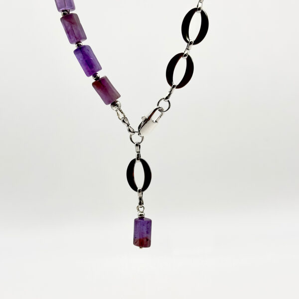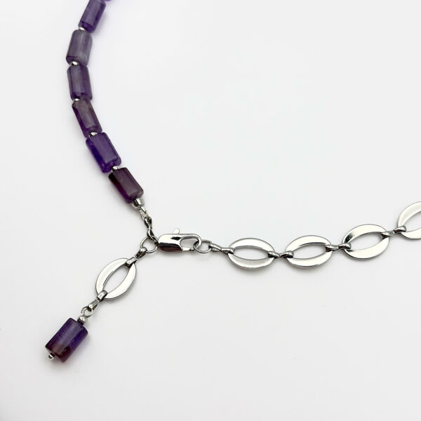 Колье из коллекции Raw Beauty объединяет минимализм и природное изящество. Фиолетовые бусины из аметиста на ювелирном тросике, дополненные родиевой фурнитурой, создают образ глубины и гармонии. Украшение словно хранит в себе внутреннюю силу, подчёркивая стиль и индивидуальность владельца.