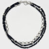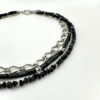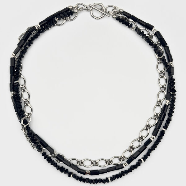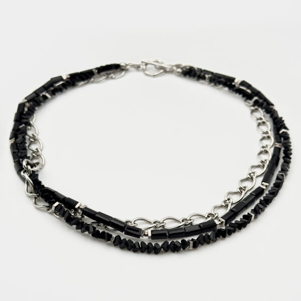Колье из коллекции Tender or Brutal создано в игре противоположностей, где мягкость линий соединяется с силой образа. Чёрные стеклянные бусины и металлические элементы образуют графичный контраст, а холодное сияние родиевой фурнитуры подчёркивает современный характер украшения.