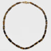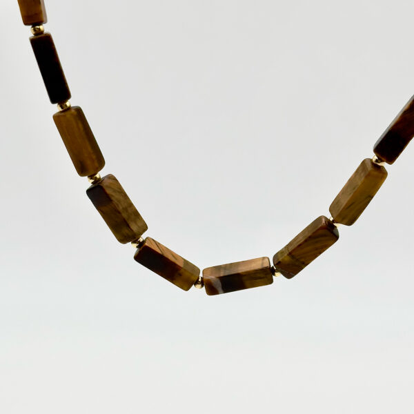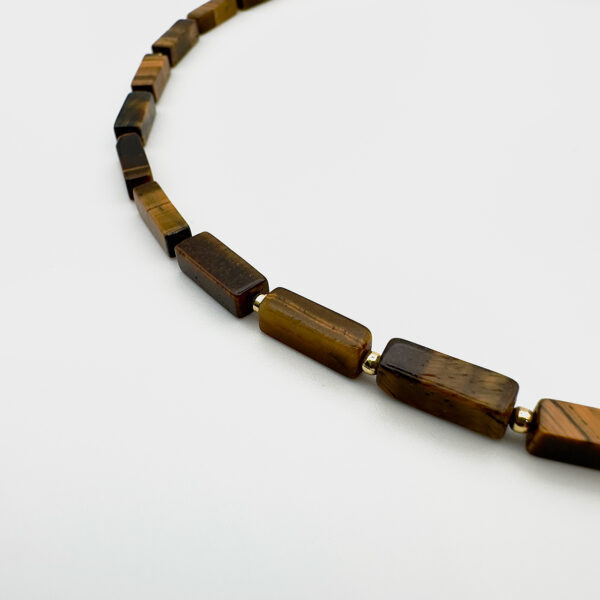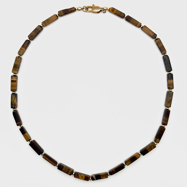 Колье из коллекции Urban Milestones создано как отражение ритма города и личных достижений. Бусины из тигриного глаза с характерным золотисто-коричневым шёлковистым бликом сочетаются с тёплым сиянием фурнитуры из золота 24К, образуя благородную палитру. Природная глубина оттенков подчёркивает характер и добавляет образу устойчивости и уверенности.