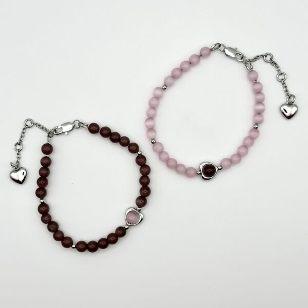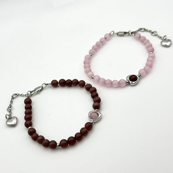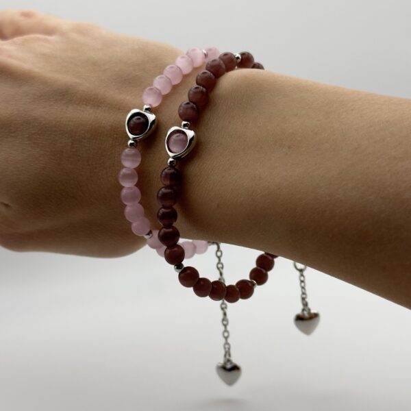 Набор браслетов из коллекции Dual Harmony с бусинами из стекла «кошачий глаз» в розово-бордовой палитре выражает идею баланса. Родиевая фурнитура подчёркивает мягкое свечение камня, а длина 18 см с удлинителем 5,5 см и размеры 16–19 обеспечивают универсальную посадку. Два браслета можно носить вместе или по отдельности, создавая разные акценты.