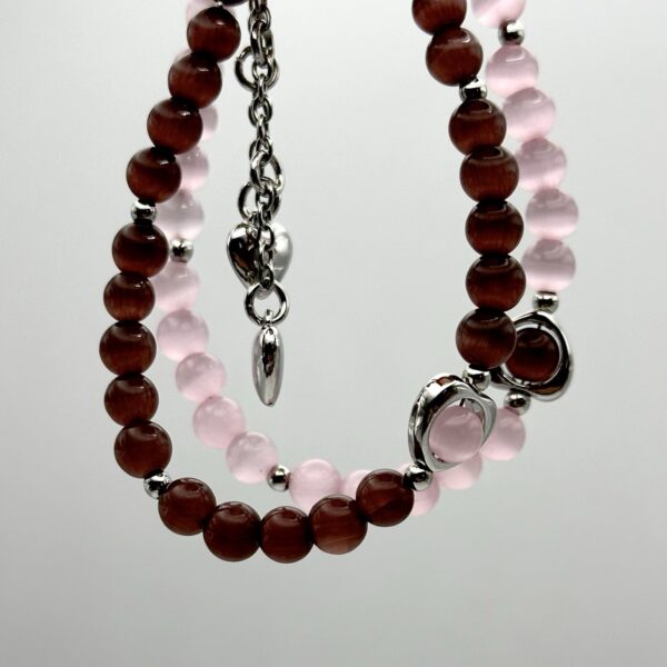 Вес — 20,9 г, застёжка — карабин-лобстер; ювелирный тросик гарантирует прочность. Концепция Dual Harmony — о гармонии двух начал: сердечные элементы символизируют эмоции, а бусины «кошачий глаз» с внутренним бликом отражают свет. Этот камень традиционно связывают с защитой и внутренним спокойствием, а игра оттенков делает каждый браслет уникальным.