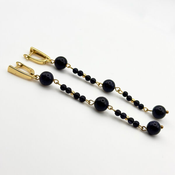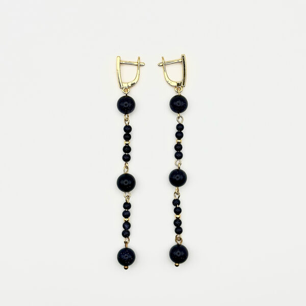 Серьги из коллекции Belt of Orion напоминают звёздное небо с его глубиной и мерцанием. Бусины из авантюрина и стекла формируют чёрно-фиолетовую палитру, оживлённую блеском покрытия цвета золота 18К. Переливы камня создают эффект мерцания, а гармония форм и цветов делает украшение выразительным акцентом. Дизайн вдохновлён космосом и таинственной красотой созвездий.