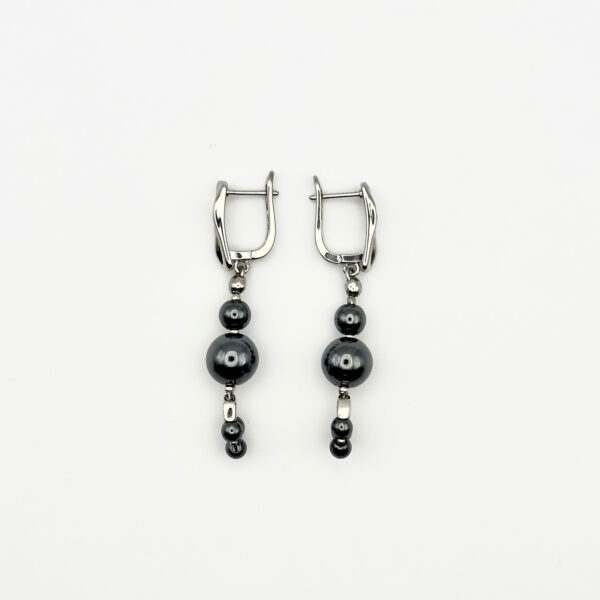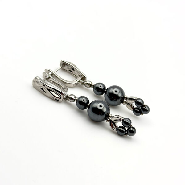 Серьги из коллекции Demeter с бусинами из гематита и металла раскрывают образ силы и гармонии. Чёрный цвет делает композицию строгой, а родиевая фурнитура добавляет холодного блеска, превращая украшение в акцент для торжественных и романтических сетов.