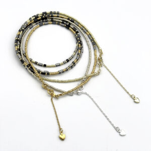 - Материалы, которые поддерживают линию. Японский металлизированный бисер Miyuki выбран за стойкость к истиранию. Бусины из гематитового стекла дают плотный, собранный блеск. Медная фурнитура с гальваническим покрытием благородными металлами и ювелирный тросик держат форму, чтобы ритм оставался ровным и спокойным в носке.