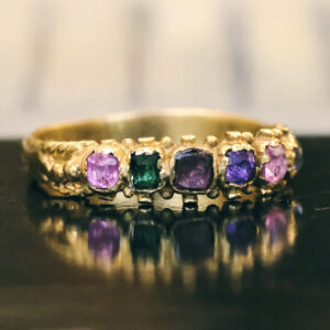 В георгианскую и викторианскую эпохи в Англии вошли в моду акростические украшения. Слова в них “писались” первыми буквами названий камней. Один из самых известных примеров, REGARD (выражение признательности) складывался из таких камней: Ruby (рубин), Emerald (изумруд), Garnet (гранат), Amethyst (аметист), Ruby (рубин), Diamond (бриллиант). Именно этот принцип и эту последовательность описывает National Jeweler, а GIA уточняет, что акростические украшения набрали популярность в 1820–1830-х и оставались заметными большую часть викторианского периода.