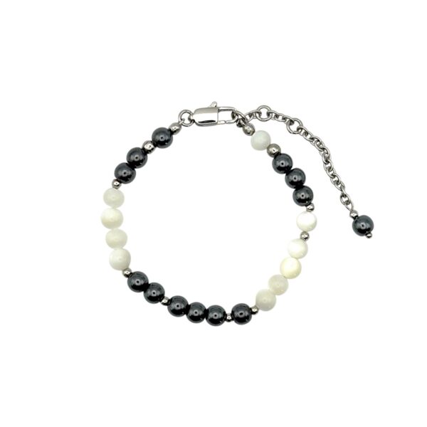 Браслет із колекції Color Crush з намистинами з білого перламутру, гематиту та металу передає свіжість і глибину. Родієва фурнітура додає холодного сяйва, а довжина 18 см з подовжувачем 6 см робить модель універсальною. Прикраса виглядає динамічно та сучасно.