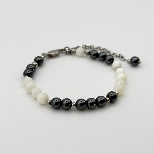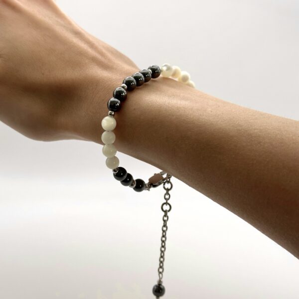 Вага – 13,5 г, застібка – карабін-лобстер; ювелірний трос і металевий ланцюг забезпечують міцність і комфорт. Колекція Color Crush – історія про імпровізацію і легкість: перламутр м’яко переливається, гематит символізує стійкість і енергію, а метал створює чіткий ритм. Комбінація матеріалів підкреслює багатошаровість образу і його індивідуальність.