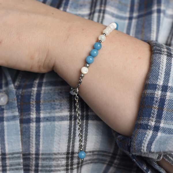 Браслет з колекції Color Crush з намистинами з білого і блакитного перламутру, скла і металу передає відчуття легкості та грайливості. Родієва фурнітура підкреслює сяйво палітри, а довжина 19 см з подовжувачем 7 см дозволяє регулювати посадку. Композиція має динамічний і свіжий вигляд.