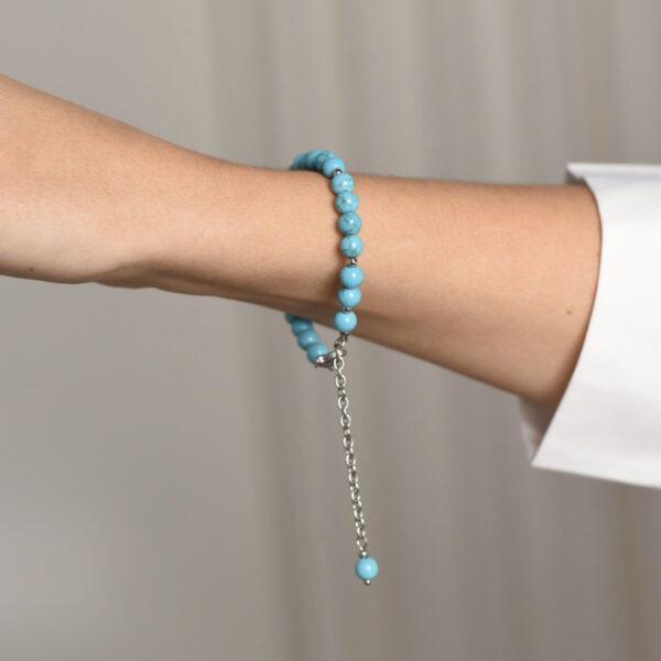 Браслет із колекції Color Crush з намистинами з блакитного говліту та металу створює життєрадісний акцент. Родієва фурнітура додає холодного сяйва, а довжина 18,7 см з подовжувачем 7 см забезпечує зручність і універсальність. Легка асиметрія надає виробу динаміки та непередбачуваності.