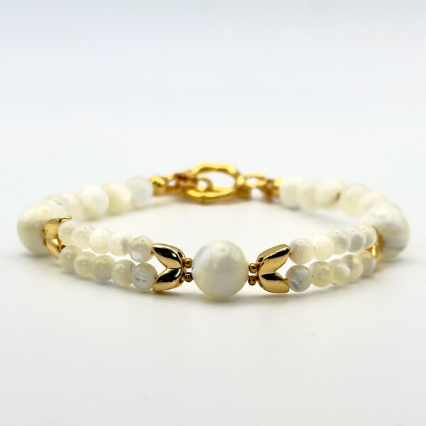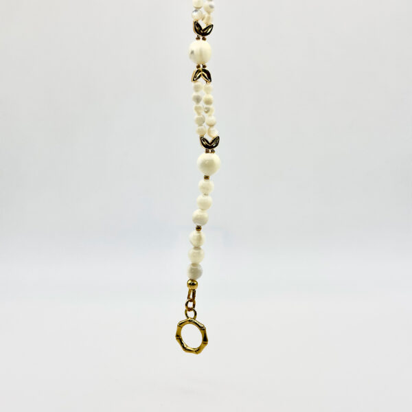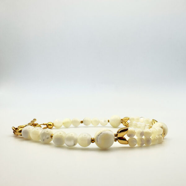 Браслет із колекції Demeter з намистинами з перламутру та металу розкриває красу природних форм. Біла палітра має чистий і свіжий вигляд, а фурнітура з покриттям золота 24К додає тепла і вишуканості, перетворюючи прикрасу на витончений акцент.