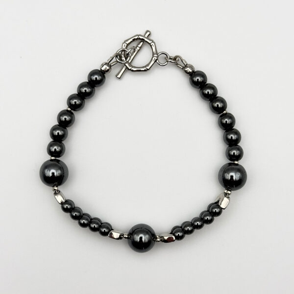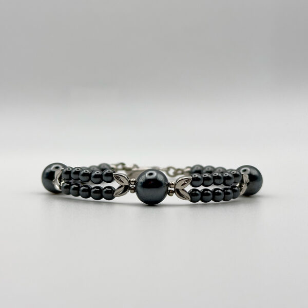 Браслет з колекції Demeter з намистинами з гематиту і металу втілює гармонію сили та елегантності. Чорна палітра робить образ строгим, а родієва фурнітура додає холодного сяйва. Прикраса виглядає стильно і сучасно, зберігаючи природний символізм.
