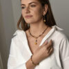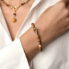 Браслет із колекції Dune Sunset з намистинами з мукаїту та металу розкриває тепло природної палітри. Жовті, коричневі та фіолетові відтінки переливаються м’яко і природно, а фурнітура з покриттям золота 14К надає вишуканого акценту. Композиція виглядає гармонійно і сучасно.