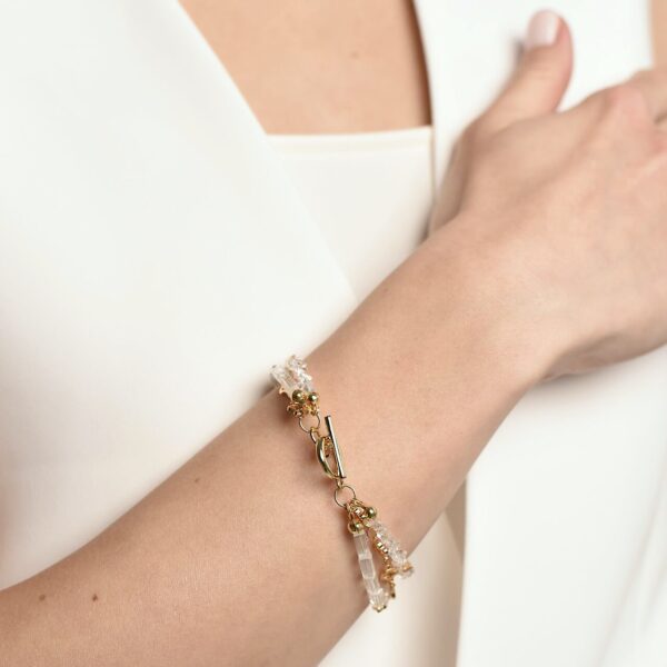 Браслет із колекції Lucky Shine з білими намистинами зі скла уособлює легкість і витонченість. Фурнітура з покриттям золота 18К додає теплого сяйва, а лаконічна форма робить виріб універсальним вибором для офісу або урочистої нагоди.