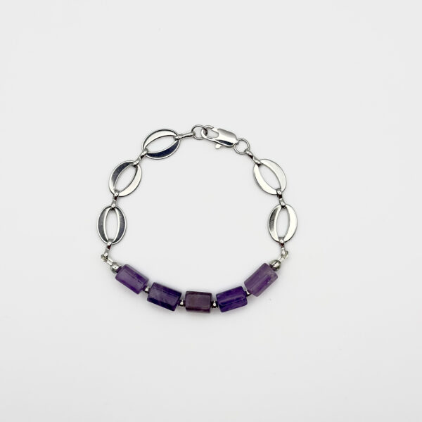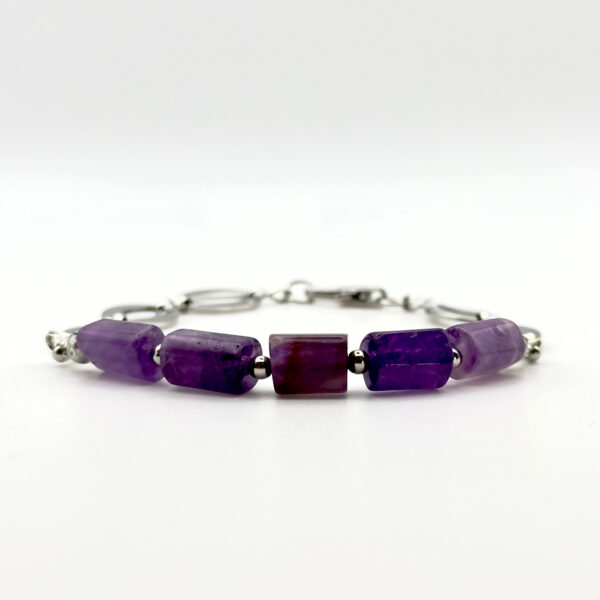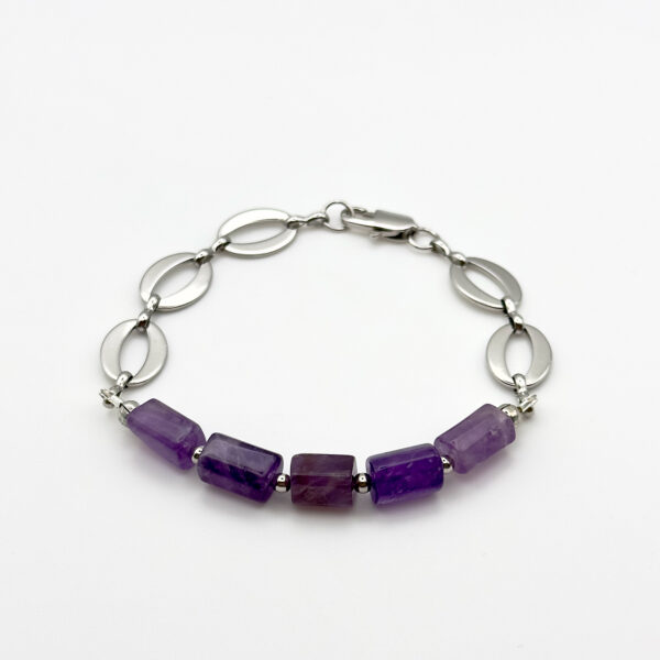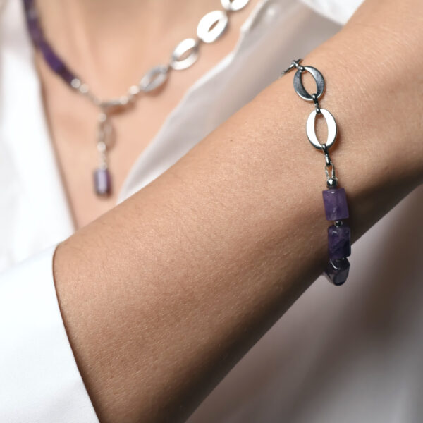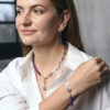 Браслет з колекції Raw Beauty створений для тих, хто шукає гармонію в простоті та силі каменю. Фіолетовий аметист, доповнений родієвою фурнітурою і зібраний на ювелірний тросик, розкриває багатство відтінків і перетворює прикрасу на стильний акцент. Її лаконічний дизайн робить образ цілісним і сучасним.