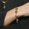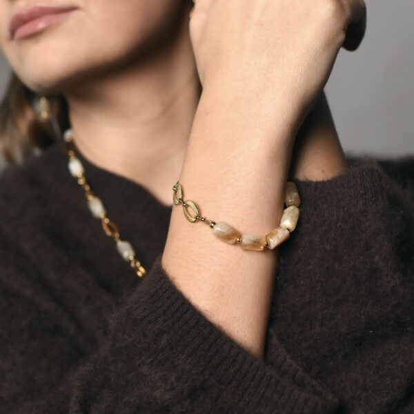Браслет з колекції Raw Beauty з намистинами з цитрину і металу уособлює поєднання природної сили та елегантності. Теплий відтінок каменю підкреслюється фурнітурою з покриттям золота 24К, а довжина 28,5 см дозволяє носити прикрасу комфортно та ефектно.