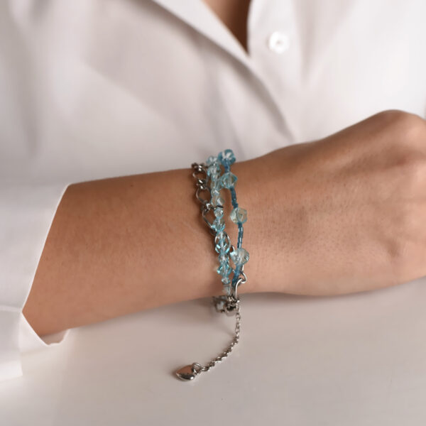 Браслет із колекції Tender or Brutal з намистинами з блакитного скла і металу виражає гру протилежностей. Родієва фурнітура надає холодного сяйва, а довжина 18,5 см з подовжувачем 7 см робить посадку зручною. Бісер Preciosa додає текстурності, підкреслюючи багатошаровість образу.