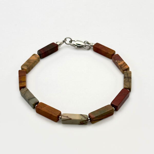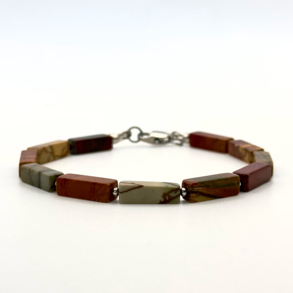Браслет з колекції Urban Milestones з намистинами з яшми і металу передає енергію мегаполісу. Багатобарвна палітра – коричневий, бордовий, зелений і жовтий – створює яскравий контраст, а родієва фурнітура додає сучасного блиску. Композиція виглядає динамічно і стильно.