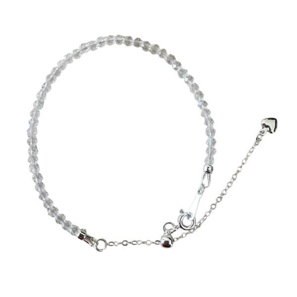 Фурнітура зі срібним покриттям підкреслює тендітну красу прозорих намистин. Довжина регулюється від 17 до 22 см, що робить браслет зручним для різних розмірів зап’ястя. Вага – 3,2 г. Мініатюрне сердечко на кінці подовжувального ланцюжка додає витонченості та символізму.