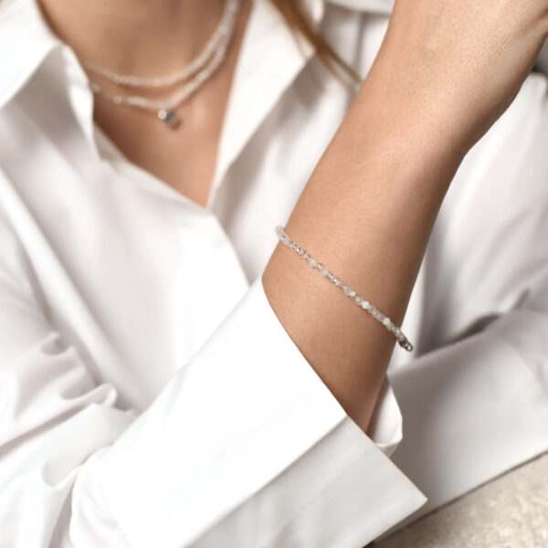 Колекція Zirconia Core натхненна формою кола – символом завершеності та внутрішньої рівноваги. Білі намистини з цирконію заломлюють світло, створюючи ефект прозорості та легкості. Браслет універсальний: він однаково доречний в офісі, в повсякденних образах і на романтичному побаченні.