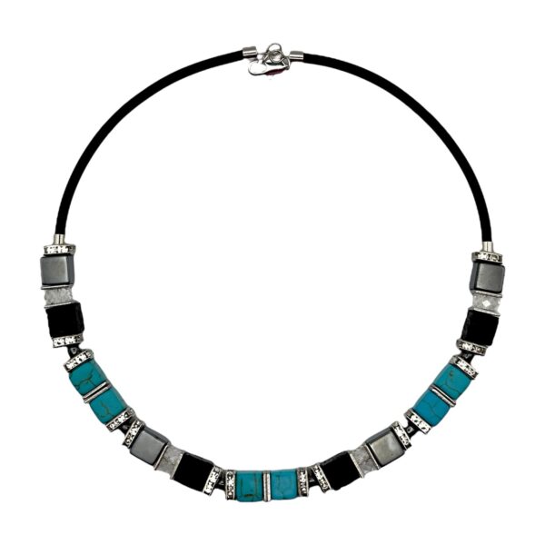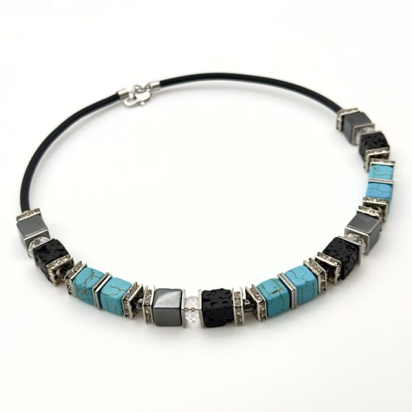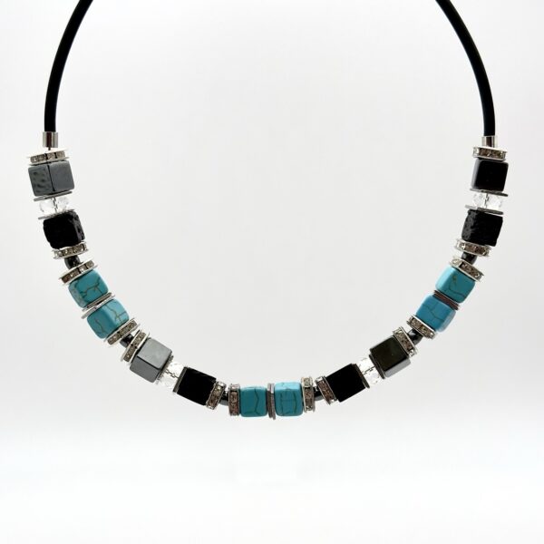 Кольє з колекції Basalt Beat з намистинами з гематиту, базальту, говліту і скла втілює силу стихій і геометричну точність. Блакитні куби контрастують з чорним каменем, а родієва фурнітура підкреслює холодне сяйво. Композиція виглядає сміливо й ефектно, зберігаючи динаміку ритму.