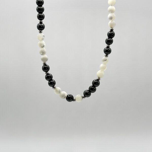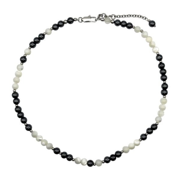 Кольє з колекції Color Crush з намистинами з білого перламутру, гематиту і металу створює контраст світла і глибини. Родієва фурнітура підкреслює холодне сяйво, а довжина 42 см з подовжувачем 6 см забезпечує зручну посадку. Модель має сучасний і виразний вигляд.
