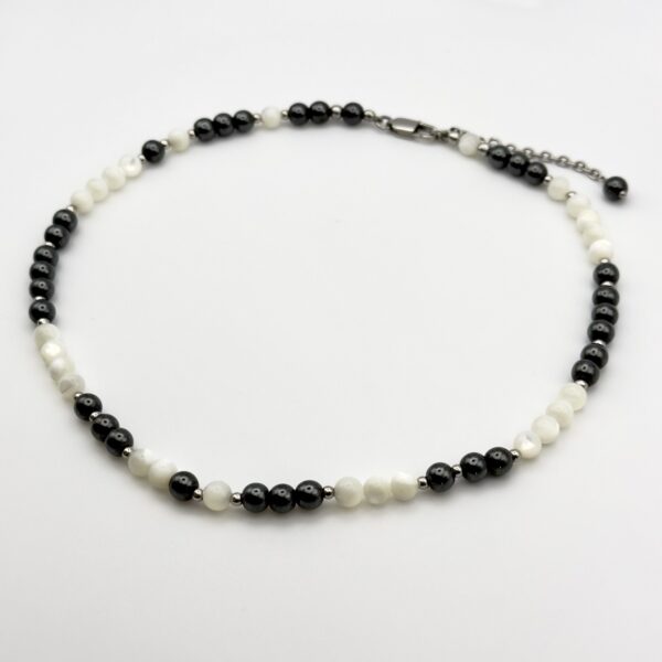 Вага – 30,6 г, застібка – карабін-лобстер; ювелірний тросик і металевий ланцюг гарантують міцність. Колекція Color Crush натхненна свободою та імпровізацією: перламутр віддзеркалює м’які переливи, гематит додає сили та стійкості, а метал фіксує ритм композиції. Контраст матеріалів робить кожен виріб унікальним і живим.
