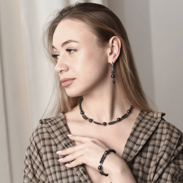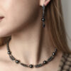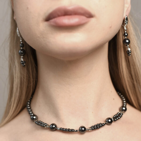 Кольє з колекції Demeter з намистинами з гематиту і металу втілює силу та елегантність. Чорна палітра має виразний вигляд, а родієва фурнітура додає холодного сяйва, перетворюючи прикрасу на стильний акцент для повсякденних і ділових образів.