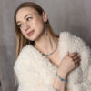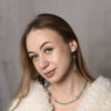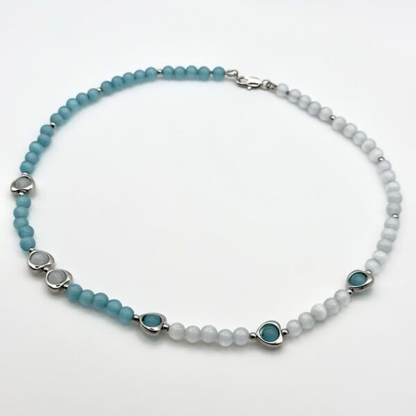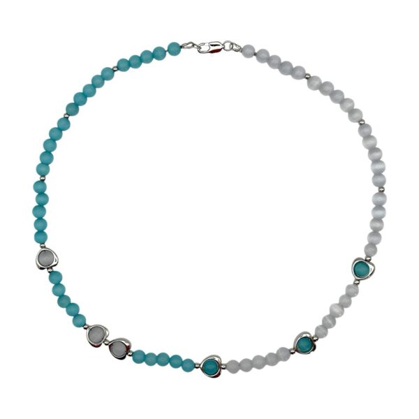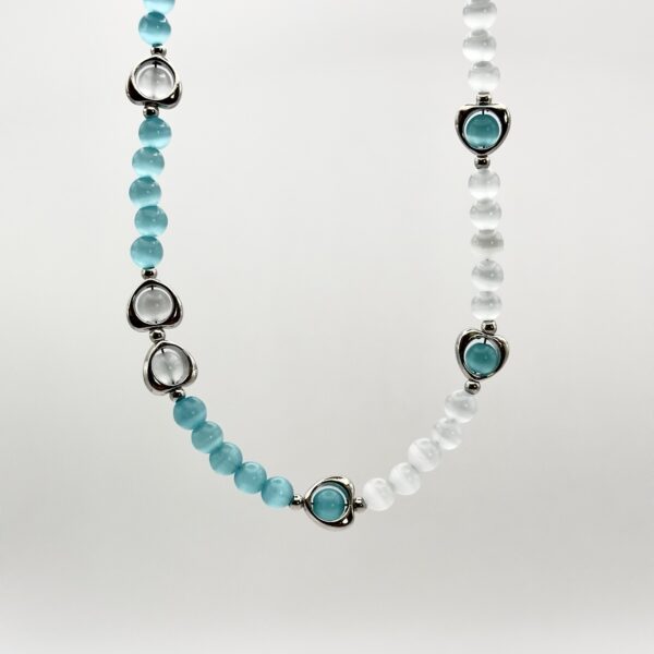 Кольє з колекції Dual Harmony з намистинами зі скла “котяче око” в біло-блакитній палітрі виражає баланс і легкість. Родієва фурнітура підкреслює холодне сяйво, а довжина 44,5 см робить силует виразним і зручним для повсякденних образів.