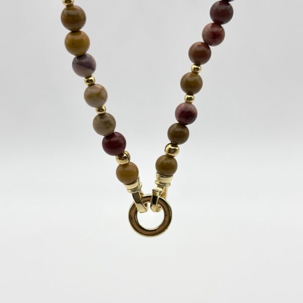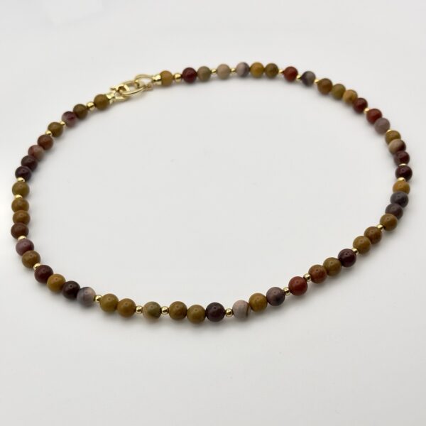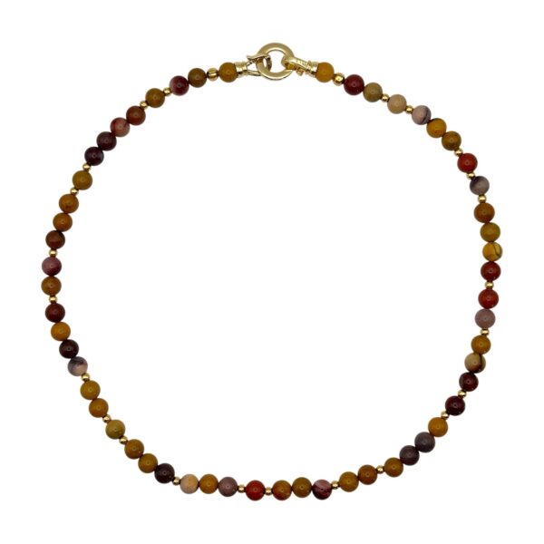 Кольє з колекції Dune Sunset з намистинами з мукаїту і металу передає тепло заходу сонця і спокій природи. Палітра жовтих, коричневих і фіолетових відтінків створює атмосферу умиротворення, а фурнітура з покриттям золота 14К підкреслює м’яке сяйво. Композиція має елегантний і виразний вигляд.