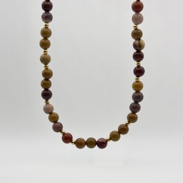 Довжина – 43 см, вага – 23,2 г, застібка – кліпса; ювелірний тросик і металеві елементи забезпечують надійність. Колекція Dune Sunset натхненна моментом, коли сонце ховається за обрієм: переливи мукаїту відображають гру світла, а металеві акценти підкреслюють ритм. Мукаїт традиційно пов’язують із внутрішньою силою і гармонією, його природний малюнок робить кожен виріб унікальним.