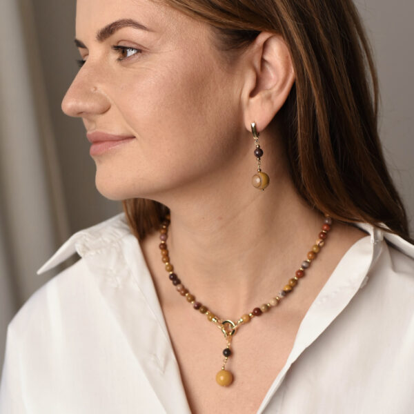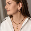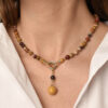 Кольє з колекції Dune Sunset з намистинами з мукаїту і металу передає тепло заходу сонця і спокій природи. Палітра жовтих, коричневих і фіолетових відтінків створює атмосферу умиротворення, а фурнітура з покриттям золота 14К підкреслює м’яке сяйво. Композиція має елегантний і виразний вигляд.