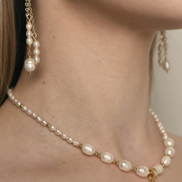 Довжина – 42 см, вага – 17 г, застібка – тогл; ювелірний трос і металеві елементи забезпечують надійність і акуратну посадку. Ідея колекції – сонячні відблиски на воді: гладкі перлинні намистини відбивають світло, а золоті акценти ведуть погляд по лінії шиї. Перли традиційно символізують чистоту, жіночність і внутрішню гармонію, їхній м’який блиск додає глибини образу.