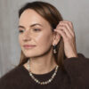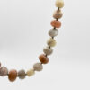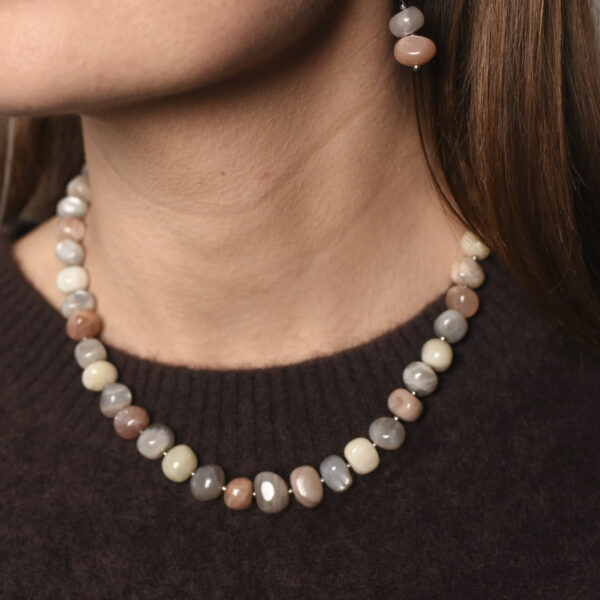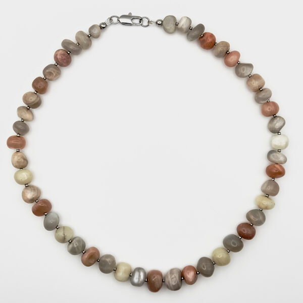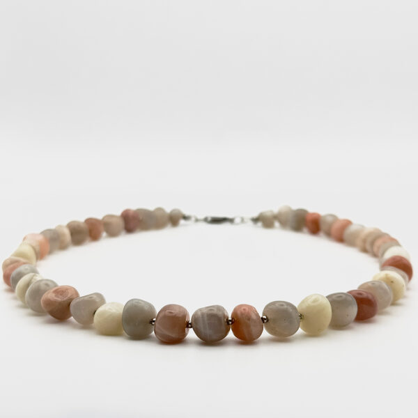 Кольє з колекції Lunar Glow поєднує відтінки білого, сірого, бежевого і персикового. Намистини з адуляру (місячного каменю) зібрані на ювелірний тросик і переливаються м’яким внутрішнім світлом. Родієве покриття фурнітури підкреслює прохолоду палітри, а переходи кольорів створюють враження живого руху. Дизайн виглядає легким і універсальним, зберігаючи в собі атмосферу спокою.