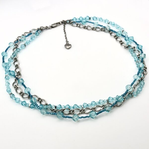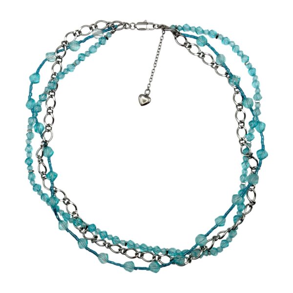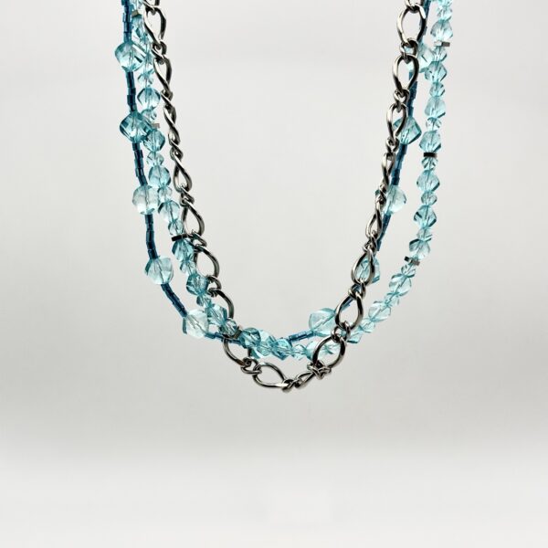 Кольє з колекції Tender or Brutal з намистинами з блакитного скла і металу розкриває характер контрастів. Родієва фурнітура підкреслює холодне сяйво, а довжина 51 см з подовжувачем 7 см створює виразний силует. Бісер Preciosa додає фактуру та візуальну глибину.