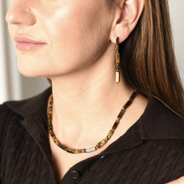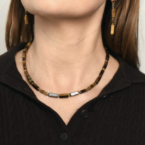 Кольє з колекції Urban Milestones створено як відображення ритму міста та особистих досягнень. Намистини з тигрового ока з характерним золотисто-коричневим шовковистим відблиском поєднуються з теплим сяйвом фурнітури із золота 24К, утворюючи благородну палітру. Природна глибина відтінків підкреслює характер і додає образу стійкості та впевненості.