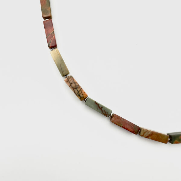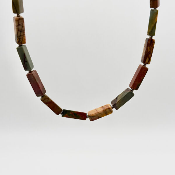 Довжина – 45 см, вага – 18 г, застібка – карабін-лобстер; ювелірний тросик і металеві елементи гарантують надійність. Ідея колекції – міські віхи: сувора форма каменів нагадує ряди будівель і вулиці мегаполісу. Яшма з природними малюнками прожилок традиційно символізує стійкість і енергію, а метал підтримує чіткий ритм. Контраст природного та урбаністичного створює виразний силует.