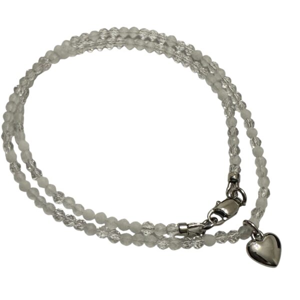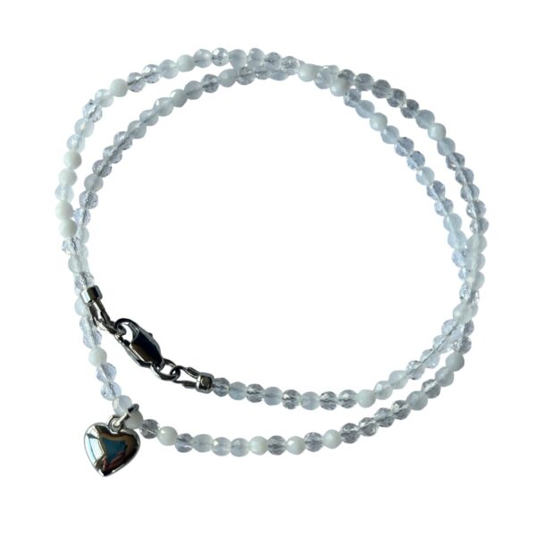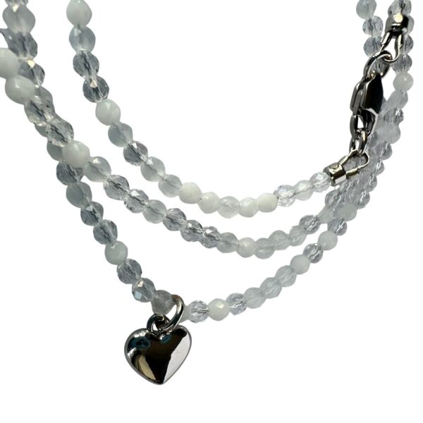 Кольє Zirconia Core з міксом білих намистин – прозорих, напівпрозорих і матових – випромінює легкість і внутрішній спокій. М’яке сяйво граней створює ніжну гру світла, а срібляста фурнітура підкреслює холодний блиск і витонченість. У центрі – акуратний кулон-сердечко, символ любові та гармонії.
